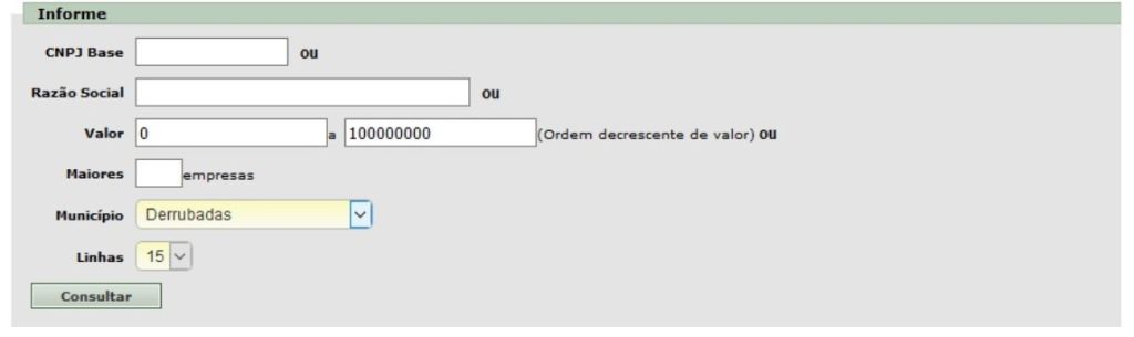 Pode-se consultar especificando CPF, CNPJ, RAZÃO SOCIAL ou Valor da dívida. Para consulta mas abrangente basta preencher um valor inicial e final e selecionar o Município, tendo-se acesso a lista dos devedores do municipio conforme imagem ilustrativa abaixo.